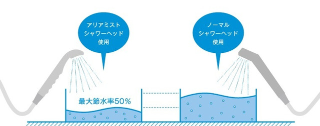 このシャワーヘッドはカップが装着されていなくても、アリアミストの持つ特徴「ミックスジェット」によって節水シャワーとしての効果を示します。