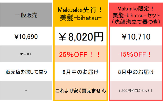 Makuake先行の限定価格として美髪-bihatsu-を最大25%OFFにてご提供!数量限定ですのでお早めにお申し込みください。これほど安く買える所はMakuake以外にありません!