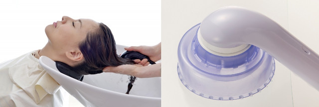 髪をすすいでもらうときの「ちゃぱちゃぱ」を再現するために、伸縮素材を用いることは早い段階から決まっていましたが、それ以外のことが決まらず、苦戦していたところ、シャワーヘッドのノウハウを持つ(株)田中金属製作所のシャワーヘッド「アリアミスト」の紹介とご協力をいただきながら、たどり着いたのが今回ご紹介する