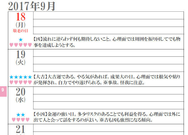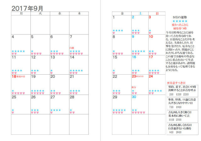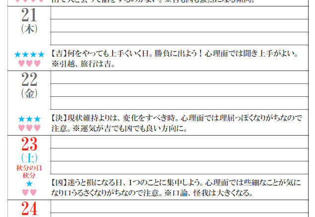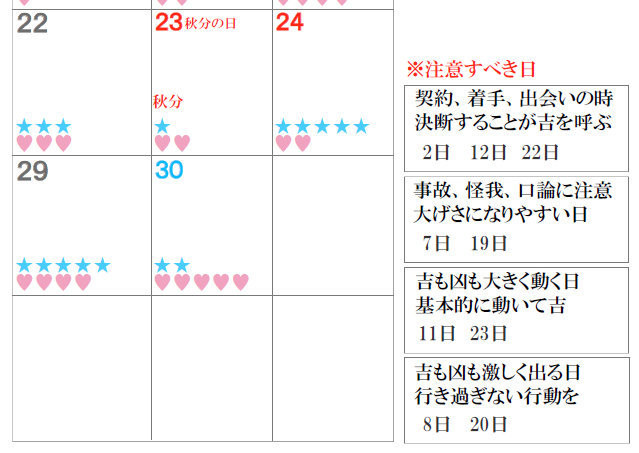 また、注意すべき日として契約、告白など決断をする日、事故、怪我になどが大きくなりやすい日などを記してあります。