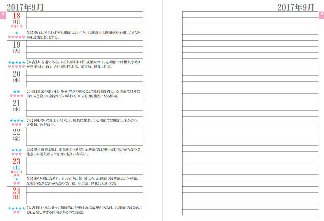 週間スケジュールページには毎日の運勢、心理面のコメント、更に要注意日の場合は特にその日に注意すべきことを記してあります。