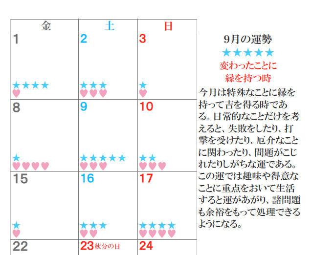 運勢の吉凶の度合いは★の数で、心理状態は❤の数で表しています。