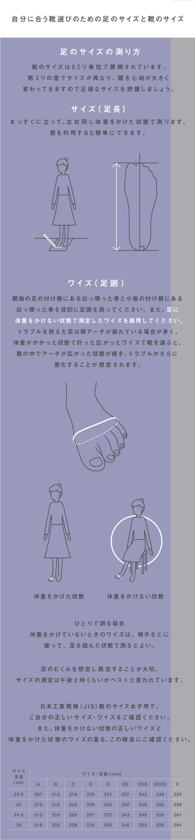 正しいサイズ、ワイズ、足型を知って、足に合った靴のチェック方法を知るだけでも生活が格段に楽になります。足は全体重を支える大事な役割を担っています。無理な消耗を避け、おしゃれを楽しみながら、健康で快適な生活を一人でも多くの人に送っていただけたらと切に願っています。