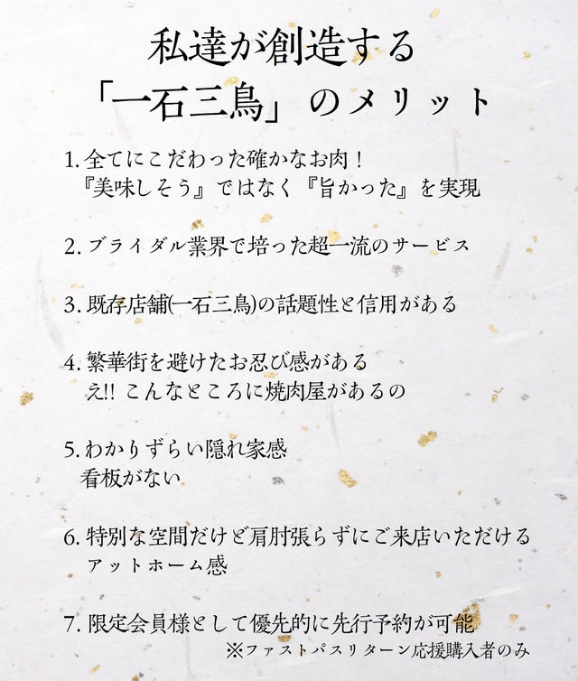 - 東京で話題の一石三鳥が大阪福島区へ進出!培った経験を全て賭け、看板のない隠れ家焼肉店をオープン