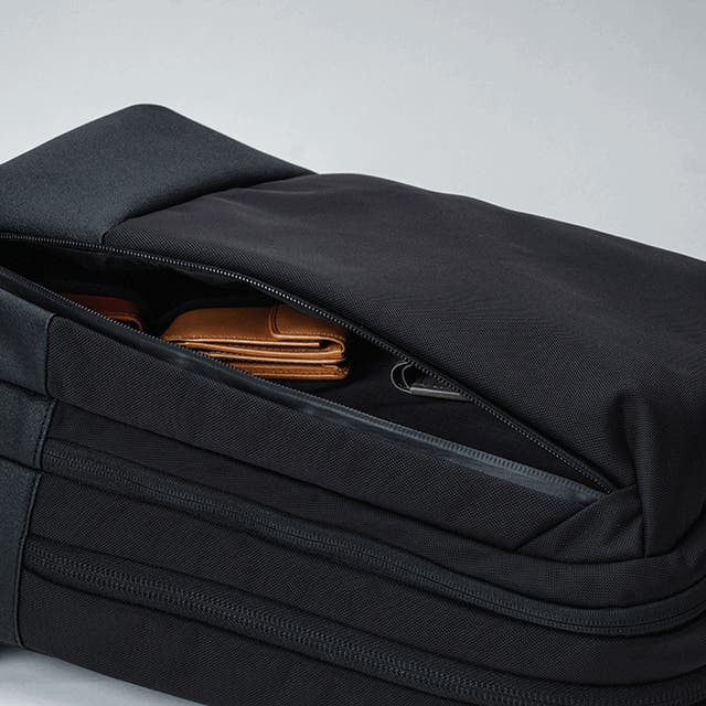 満員電車内での前背負いでも取り出しやすいトップポケットには起毛素材、YKK止水ファスナーを採用しました。それによりガジェットの保護性も高いです。