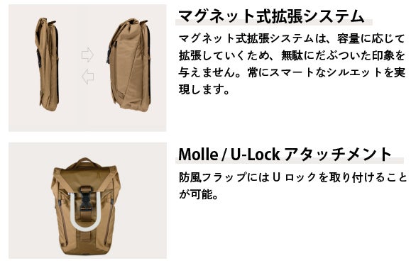 試行錯誤を重ね完成したこのデザインは、通常の拡張型バックと異なり段階的に必要な分だけ拡張していくため、無駄にだぶついた印象を与えることもありません。