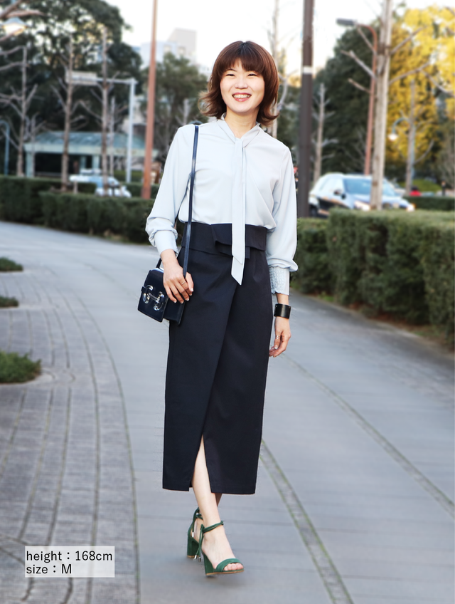 ボウタイをつけてフレアスカートに合わせることで、目線を上半身から外してくれます。