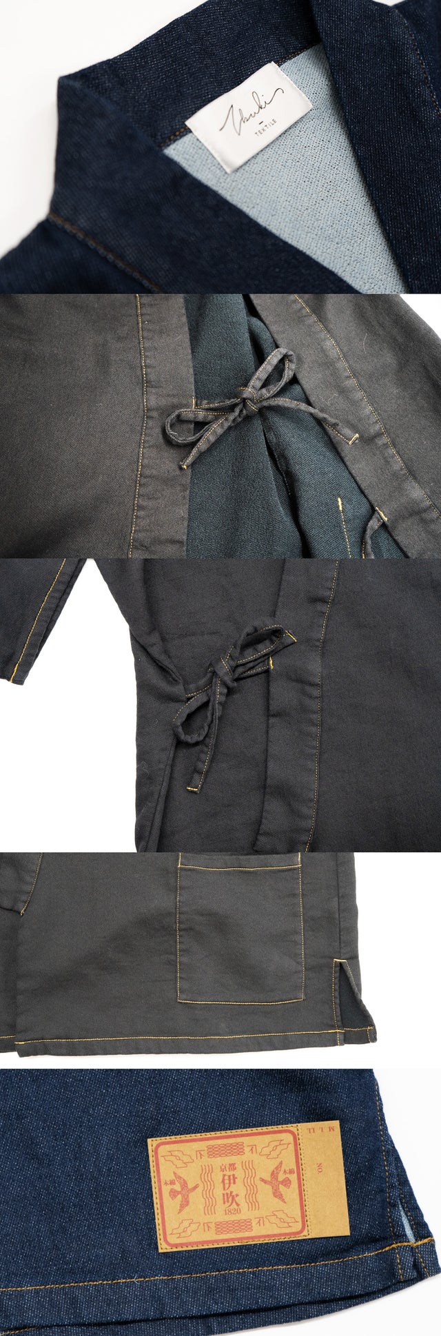 このデニム作務衣を作製している工場は伊吹と30年の付き合いがあり、和装品だけではなくデニムやストレッチのパンツなども縫製をしている工場ということもあり、昔ながらの和装品に洋品のテイストが入ったデニム生地の作務衣を完成させることができました。これは、伊吹が和装でつちかった200年のノウハウと現在こちらの縫製工場が行っているファッションアパレルを融合した新しい和装品です。