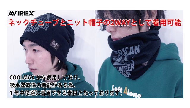 ゆったりめの着用感で被れるニット帽は、ネックチューブにも変化する2WAY仕様です。