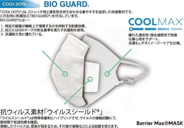 マスク外側には、「BIO GUARD®」加工を施した小松マテーレ社の「COOL DOTS®」、
