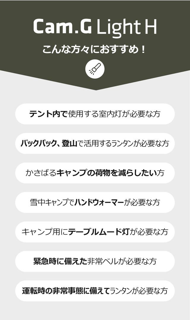 - 《光る》だけで終わらない、アウトドア用の多機能ランタン【Cam.G Light H】が誕生!