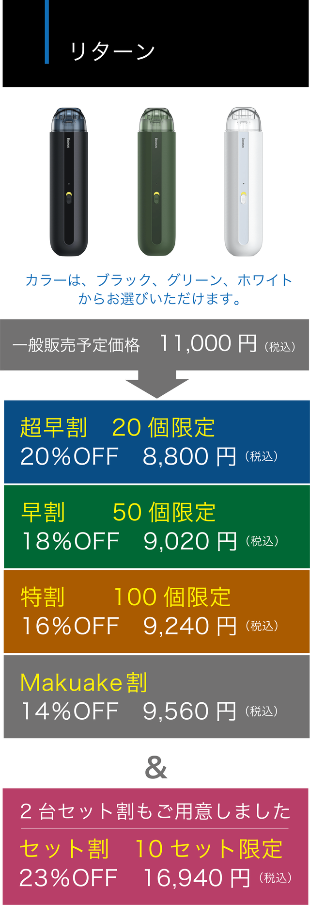 「Makuake(マクアケ)」は、実行者の想いを応援購入によって実現するアタラシイものやサービスのプラットフォームです。このページは、 プロダクトカテゴリの 「コードレスでコンパクト。スタイリッシュな持ち運び出来る「カプセル・クリーナー」」プロジェクト詳細ページです。
