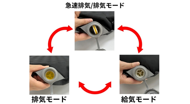 360度回転バルブの向きを変えることで、3つのモードに変換できます。