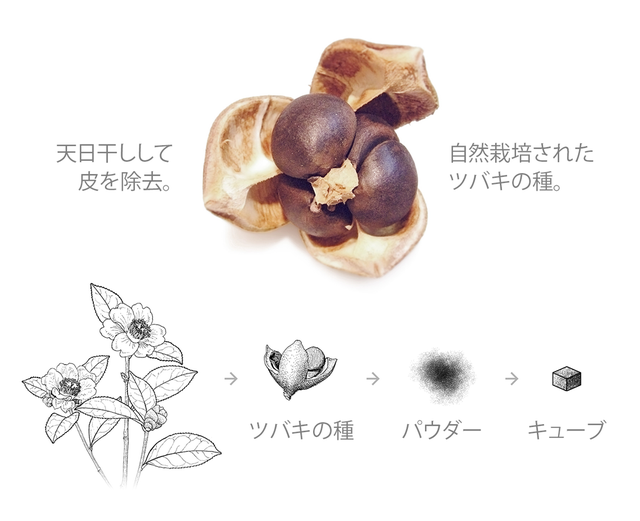 作るのが手間なためあまり注目されないツバキの天然洗浄剤を、立方体の固形にし、取り扱いやすく見た目のよいパッケージに仕上げている。