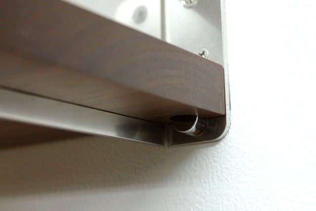 市販されているウォールシェルフ用の金具(ブラケットともいう)と棚板は製造工場が異なることが多いため別々に流通していることが多く、その為、壁のみならず金具と棚板をビスと固定するもの、もしくは、棚板がフリーの状態のものがほとんどです。