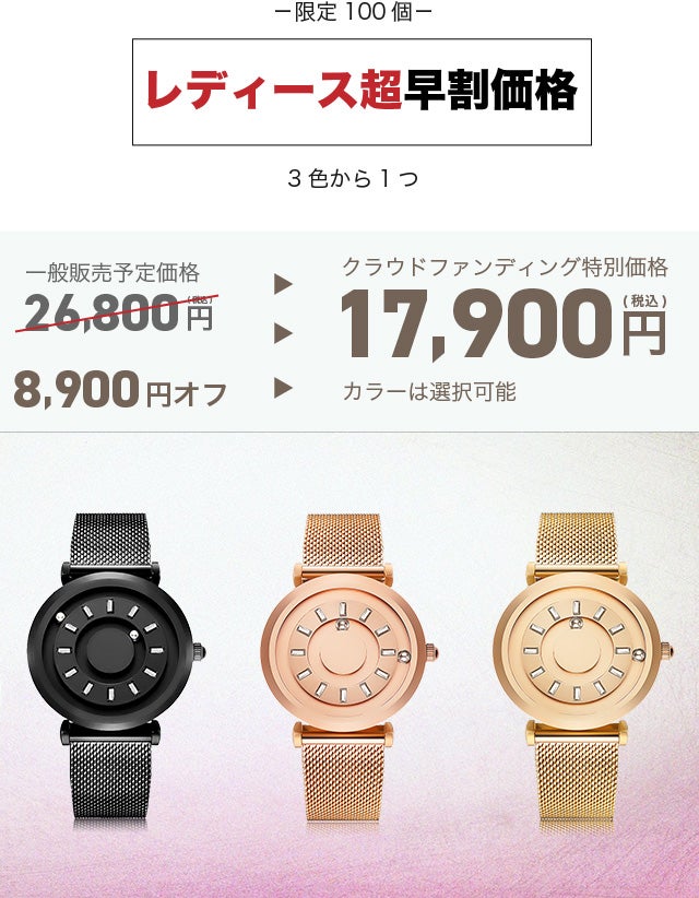 前回たくさんの応援購入をいただいた「磁力で刻む腕時計」から、今回、ご要望にお応えしてレディースのみなさまにも手にとっていただける商品をメーカーさんに作っていただきました!