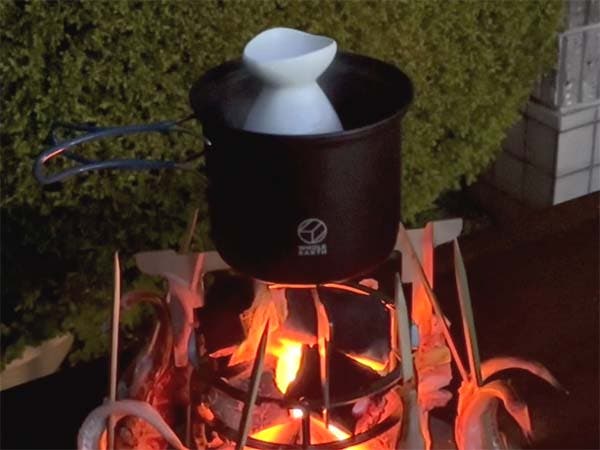 コッヘルなどをごとくに載せお湯を沸かします。お湯が沸いたら徳利に9分目ぐらいまで酒を注ぎ入れ、好みの温度に仕上げます。