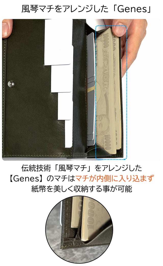 ◇メインカード8枚が整列。一級職人の独自設計で「一目瞭然」 シリーズ最小クラスのミニ長財布【Genes】