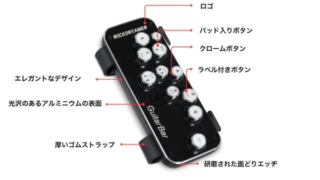 プレミアム素材を使用しており、耐久性と質感に優れています。ラベル付きボタンによりデバイスが動かない設計で安定した演奏が可能、他の類似デバイスと比べてもROCKDREAMER GuitarBarの固定性は大きな特徴です。またボタンにはコード名が記載されている為視覚的にも使いやすい設計。