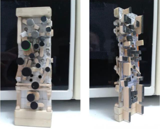 そこで、アウレリオはうまくいく方法を見つけるために奮闘し続けました。そしてアイスキャンディーの棒、バネ、接着剤を使って、実用的なプロトタイプを作り上げました。