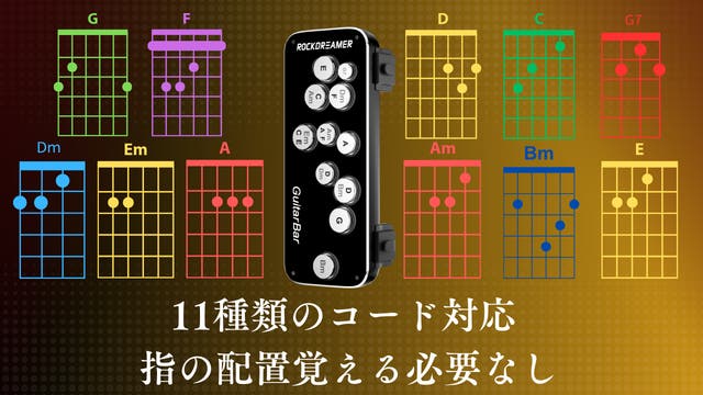 ROCKDREAMER GuitarBarは、ギターのコードで悩む全ての方に、演奏の楽しさを再び届けるためのデバイスです。指の痛みや難しいコードチェンジに悩むことなく、簡単にギター演奏の楽しさを体感していただけるようデザインされています。