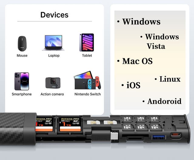 付属のUSB-Cケーブルと変換アダプターで様々な接続端子に対応し、スティック自体がカードリーダーやUSBハブの機能を備え、メディアカードも3種類の計21枚を大量収納、挙句にはスマホスタンドとしても使え、これら全てが上品で頑丈なカーボン調のアルミボディーのスティックに全て搭載!