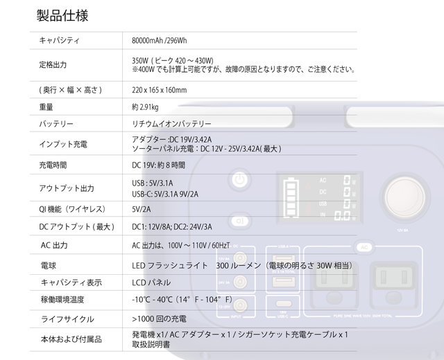 また、2020年の代名詞とまでなった新型コロナウィルス感染の恐れもあり、災害発生時であっても大勢の人が集まる避難所へ向かうのも不安です。こういった状況から防災の専門家の多くは、ポータブル電源の必要性を語ってます。「備えあれば憂いなし」いざと言う時の為に蓄電池を確保しておく事は自分自身や大切な家族を守ることに繋がります。女性でも片手で簡単に持ち運べる軽量コンパクトなボディーにパワフルパワー、災害時の非常用電源としての活用はもちろんのこと、キャンプやレジャーをはじめ、ガーデニングやベランダ作業でも大活躍です!コロナ環境下での災害対策、アウトドア必須アイテムとして選ばれています!