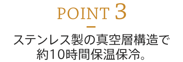 - 丈夫で金属臭が移りにくい304ステンレスを採用。真空二層構造で10時間ドリンクの温度を保つ。