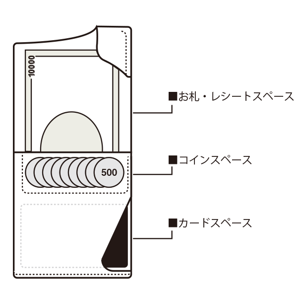 レシートや領収書はお札の前後に。分けて入れると仕分けにも便利。