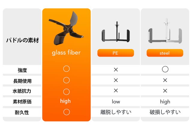 ウォーターローイングマシンにおいて重要なのがパドルの性能です。一般的なパドルとしてPEやSteel製が多いですが、KingSmithのパドルはガラス繊維製のパドルを使用しています。ガラス繊維は高温にも耐える耐久性があります。また、引張強度も強く、不織しない特性があります。