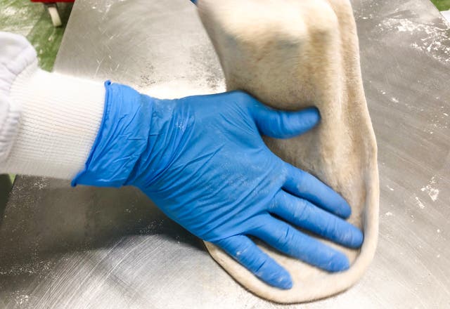 長時間発酵した「モッチリ」生地を、機械を使わず1枚1枚手作業で生地を伸ばします。