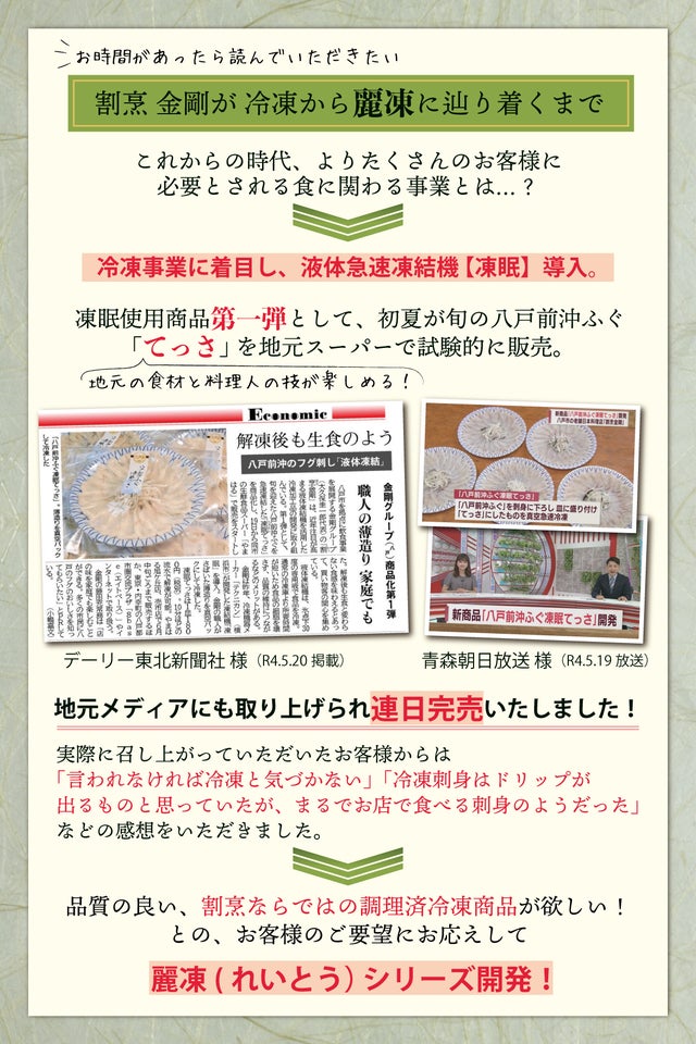 山海の恵み豊かな青森県の食材と港町八戸の割烹ならではのお料理を、さらにたくさんのお客様に楽しんでいただきたいとの思いから、特殊冷凍技術を駆使した商品開発にも取り組んでおります。今回、新たに開発した冷凍商品を【割烹金剛 麗凍(れいとう)シリーズ】として展開するにあたり、新メニューをMakuake限定で先行販売いたします。