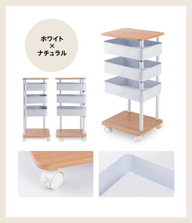 3段のトレイには、身の回りの生活用品や小物類を仕分けして収納できます。