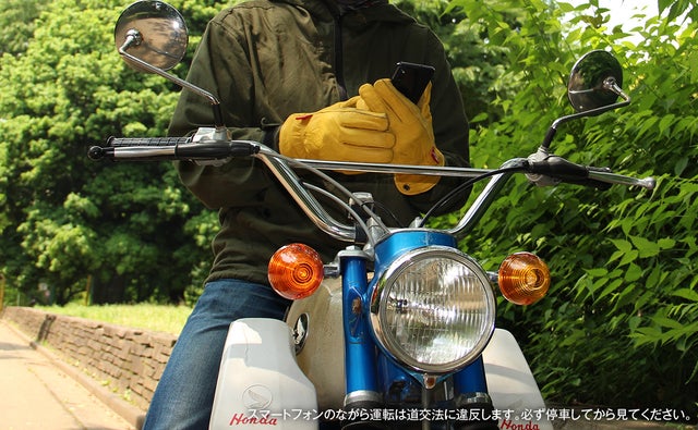 本体は柔らかなカウグレインレザー、手のひらのグリップに優れたバックスキンを採用。補強パターンをバイクのアクセルワークやレバー操作をし易い設計にしています。※スマートフォンのながら運転は道交法に違反します。必ず停車してから操作してください。