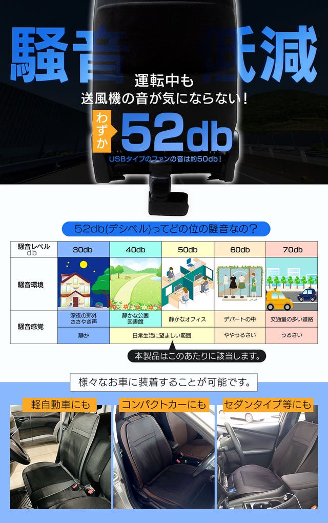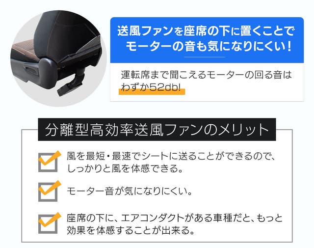運転中、ファンの音が気になるのでは?と思う方もいらっしゃると思いますが、従来の製品と異なり運転シート越しに聞こえる形になるので、ファンの音もかなり軽減されています。