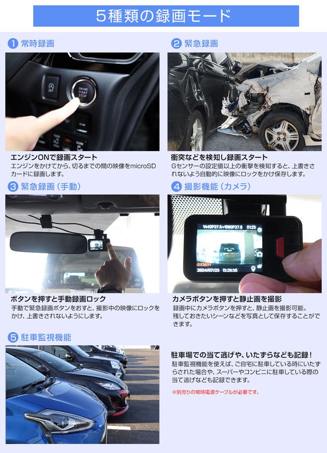 もちろんこれらのドライブレコーダーに必須の基本的な機能も充実!