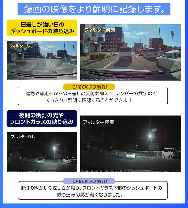 運転中の録画をより鮮明に記録できるように、運転中に眩しく感じる前走車のボディやメッキパーツからの反射光や、街灯やヘッドライトの乱反射した光を抑える偏光レンズを付属。乱反射した光をカットすることで日差しの強い日や、自車のヘッドライトで白飛びしてしまう前走車のナンバーなど鮮明に撮影可能です。