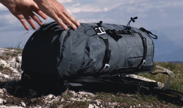 カラビナや紐などを使えば、バッグ内に収納できないトレッキングポールやアイスアックス、シェラフなどを連結でき、搭載力も大幅にアップ。