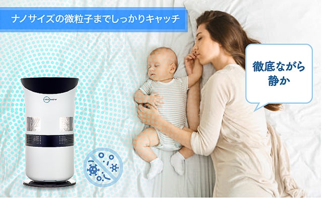 人体に被害を起こす超微粒子の浮遊物から、花粉、PM2.5、ハウスダスト、有害ガスなどを「ナノウォッシュ」がしっかり吸着して除去するので、部屋中にキレイな空気を保つことができます。