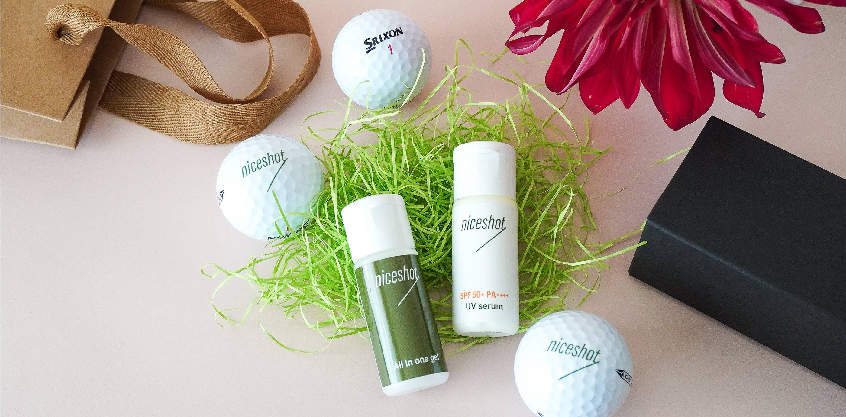 縁起のよいniceshtのロゴ入りゴルフボールと、トラベルサイズのスキンケアのセット。ゴルフを愛してやまない方、これからエイジングケアを始める方にも最適な贈りものです。