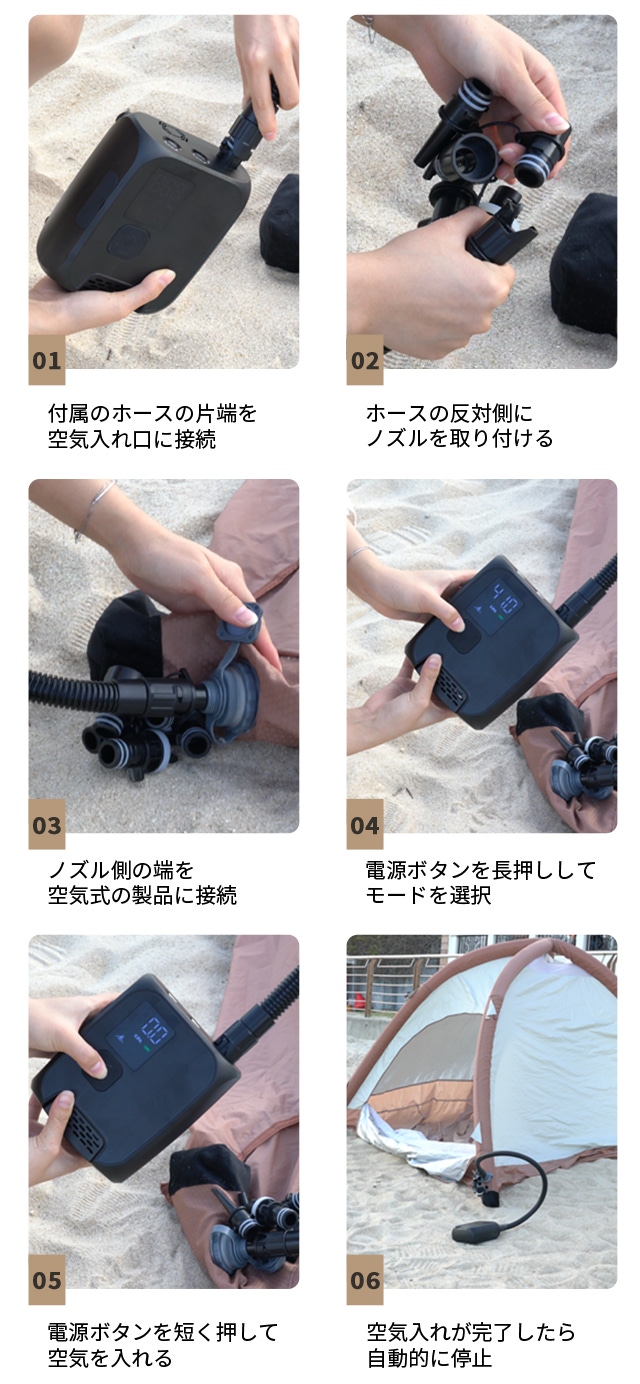 - 6種類のノズル付属、3つの空気入れモード搭載、自動停止機能……初心者でもすぐ使いこなせる!