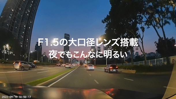ドライブレコーダーにとって、明るさは正義です。Dash Cam Omniはコンパクトなボディながら、f1.5の非常に明るい大口径レンズを搭載しており、より多くの光を取り込むことが出来るので、昼夜問わず鮮明な映像を記録するのに役立ちます。