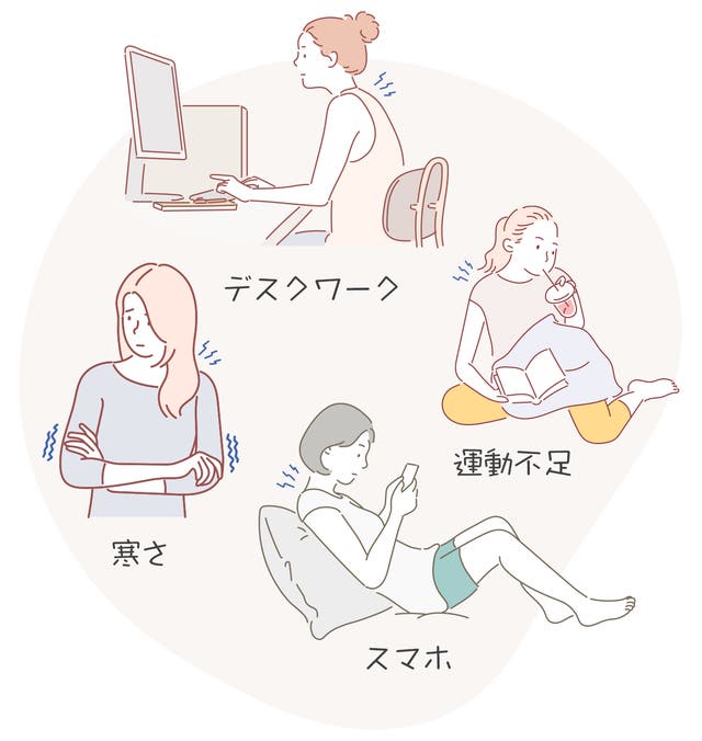 また気温の下がる秋・冬になると寒さで筋肉が硬直することが増えたり、出不精での運動不足なども肩こりの原因になっています。