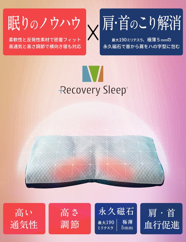 『Recovery Sleep メディカルサロンピロー』は最大190ミリテスラのハイパワーの永久磁石をリカバリーアドバイザー監修のもと肩・首のポイントに18個配置。