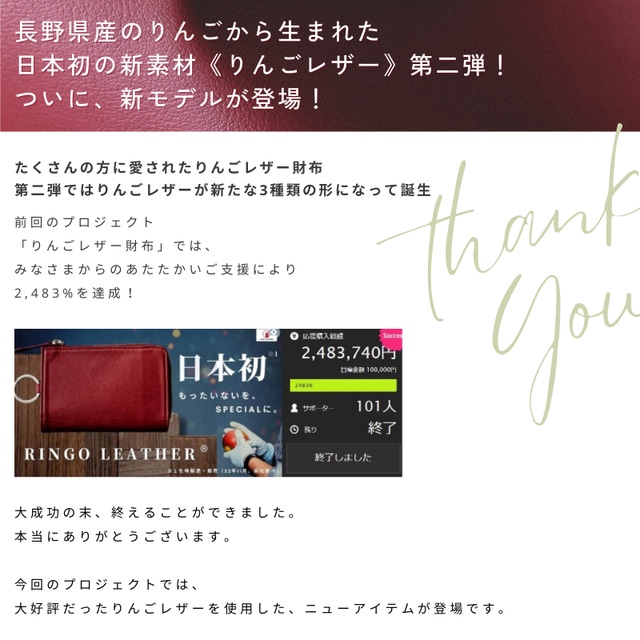 <Makuake応援購入にあたっての注意> ※使用感などに関しては、感じ方に個人差が予想される製品でございます。そのため、使用感等に関する返品・返金はお受けいたしかねます。 ※りんごレザー®商品の細かい皺は不良ではありません。素材独自の感触を楽しんでください。 ※本文中に記載させていただいたスケジュールは、あくまでプロジェクト公開時点の予定です。 応援購入の性質上、配送遅延のおそれがございます。 原則として、配送遅延に伴う応援購入のキャンセルはできませんが、リターン配送予定月から6ヶ月を超えた場合には、希望者に限りご対応させていただきます。 ※ご注文状況、使用部材の供給状況、製造工程上の都合等により出荷時期が遅れる場合があります。※皆様の応援購入により量産効率が向上した場合、正規販売価格が販売予定価格より下がる可能性もございます。 ※応援購入後のサポーター様都合によるキャンセルや返⾦は受付いたしませんのでご了解ください。 ※製品につきましては、予告なくデザイン・仕様が一部変更になる可能性ございます。 ※類似品が発生する可能性があります。 ※Makuakeの性質上、以上の注意点につきましてあらかじめご理解とご了承いただいた上で応援購入くださいますよう、よろしくお願い申し上げます。