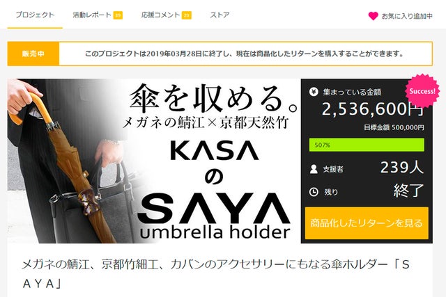 第一弾の「KASAのSAYA」では、目標金額の「507%」ものご支援を頂きました。
