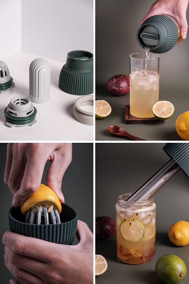 SKUZEEは日本国内で実用新案登録済みの機構を要しており、タンブラー、グラス、マグ、カラフェ、メイソンジャーなど様々な飲料用の容器に取り付けることができるBPAフリーのシリコン製キャップです。