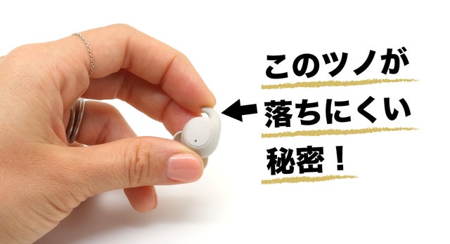 やわらかいシリコンのツノがあるのがポイントです。カナルタイプなどのイヤーピースが耳の中を圧迫して支えているイヤホンと違ってツノの部分でも支えているので、負担が少なく落下もしにくい構造になっています。