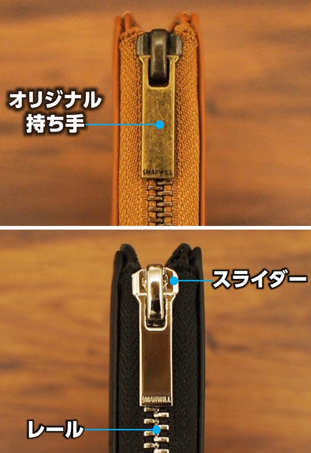財布のデザイン性を損なわないシンプルな持ち手は、型から作ったSMARWiLLオリジナル仕様です。正確にそして滑らかにスライダーを走らせてくれます。