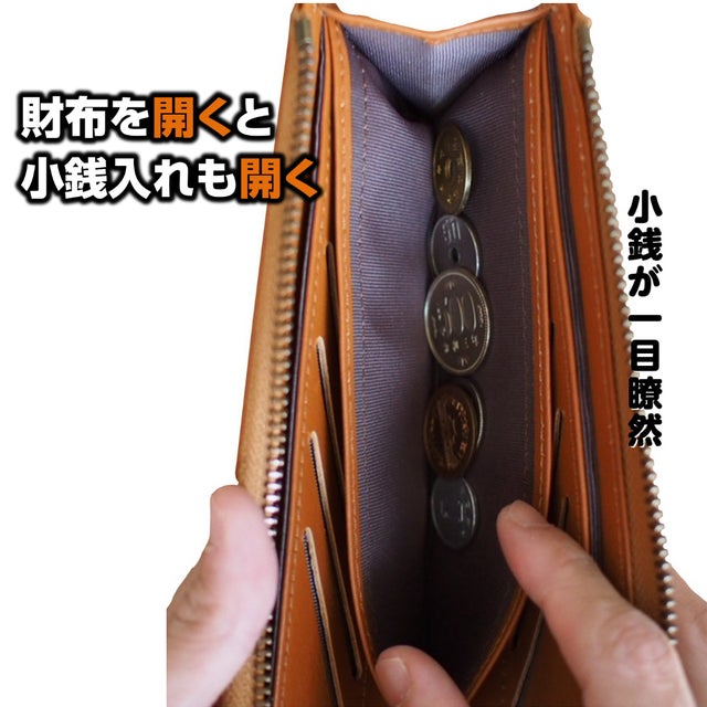 札入れをL型に縫製することで、上、斜め、横の3方向から出し入れが可能に。素早くキレイに収納でき、お札の角も常にピーン。